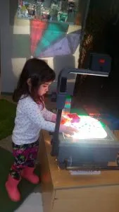 One of the ways the educators chose to explore this concept was the use of the overhead projector and magnatiles. Educators decided the overhead projector provided a romantic metaphor to the idea of “points of views”: as one constructs an idea on the overhead screen, the machine projects its own perception of the idea to the wall and although the presented idea on the wall is the same as the original one, it is a little different – it is perceived a little differently by the projector (“other”)