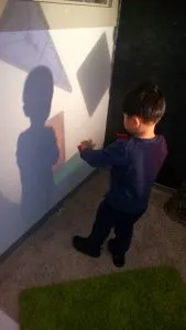 Damian (age 1.5) has been watching the exploration. He proceeds to test his own theories and moves his bottle and then the shapes around the projector screen. He sees a correlation between the movement on the screen and shadows on the wall. He continues to test his theory by periodically moving objects on the screen and checking the wall.