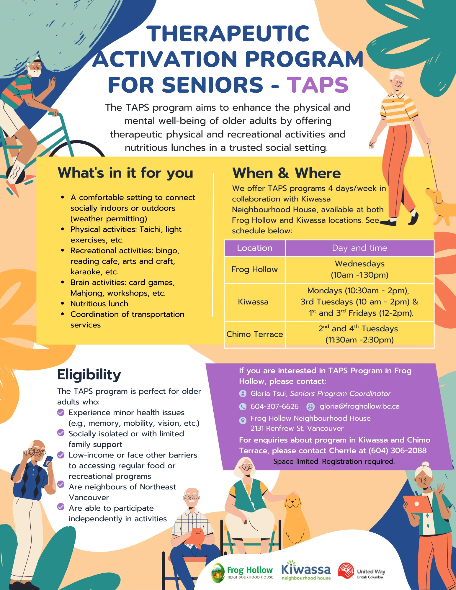 We offer TAPS programs 4 days/week in collaboration with Kiwassa Neighbourhood House, available at both Frog Hollow and Kiwassa locations. See schedule below: