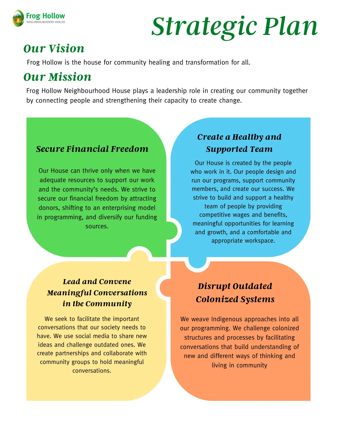 At Frog Hollow Neighbourhood House, we believe in the power of community to create meaningful change. Our Strategic Plan for 2024-2027 is a roadmap for how we will continue to lead, support, and strengthen our community over the next three years.