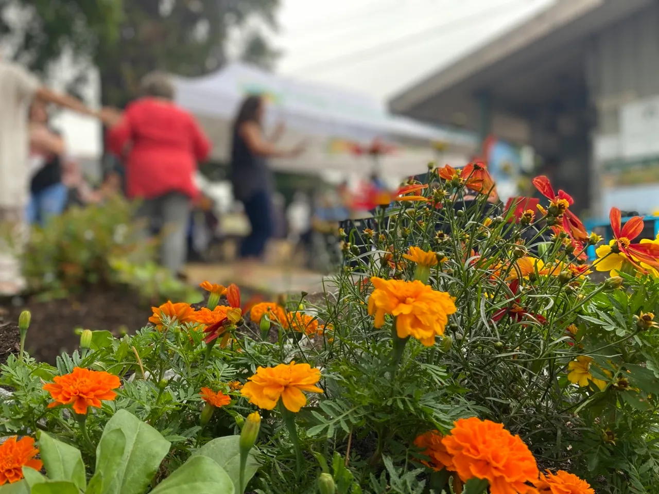 A circle of orange flowers at the centre is honouring all the children uncovered on Residential School grounds. Around the circle are the four quadrants planted with Indigenous plants traditionally used for medicine or food, representing the four teachings of a Medicine Wheel.