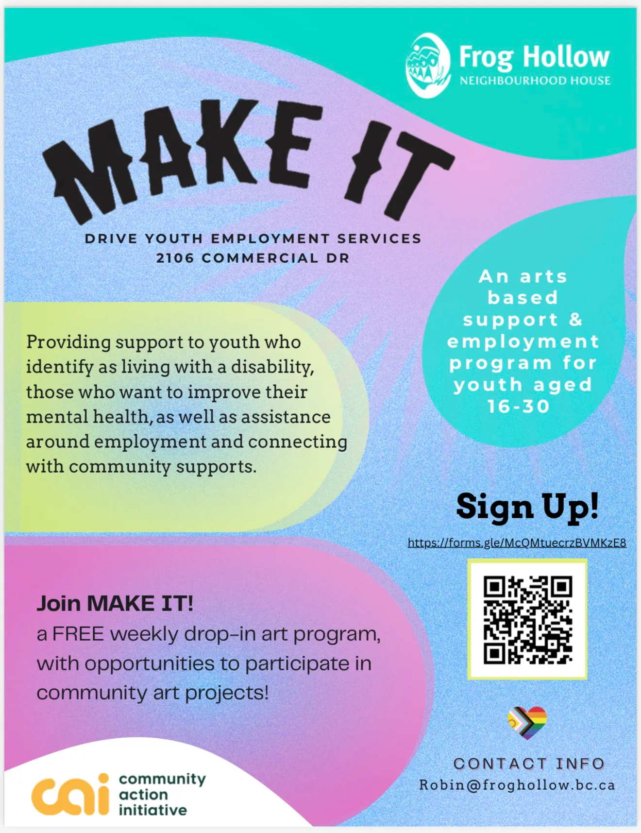 For youth ages 16-30, for folks that want to improve mental health through art making, living with a disability, neurodivergent or wanting to connect with community